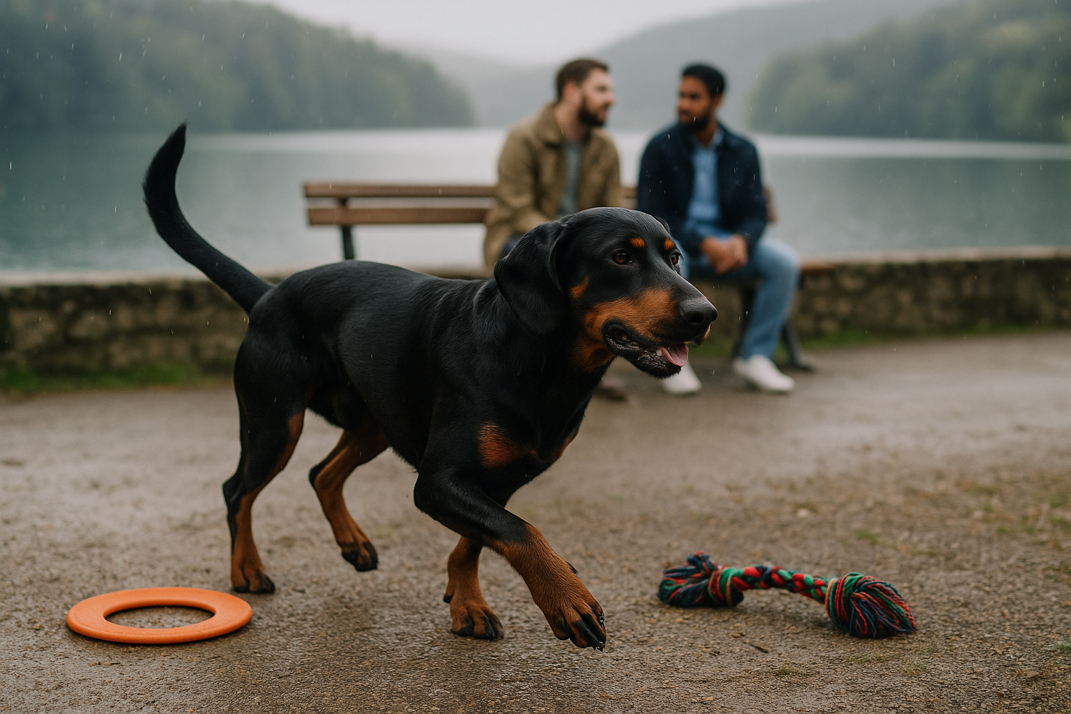 - Sa couleur : La robe de ce chien est principalement noire, agrémentée de marques feu brun à acajou qui se situent au niveau des membres, apportant un contraste élégant à son apparence.